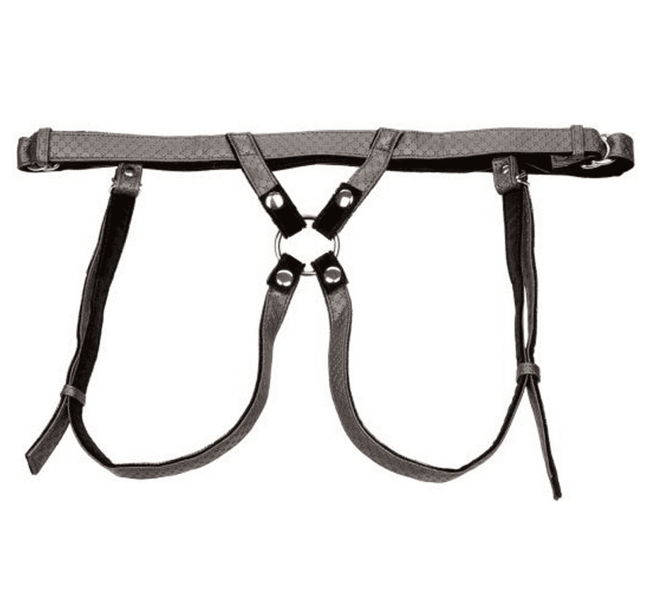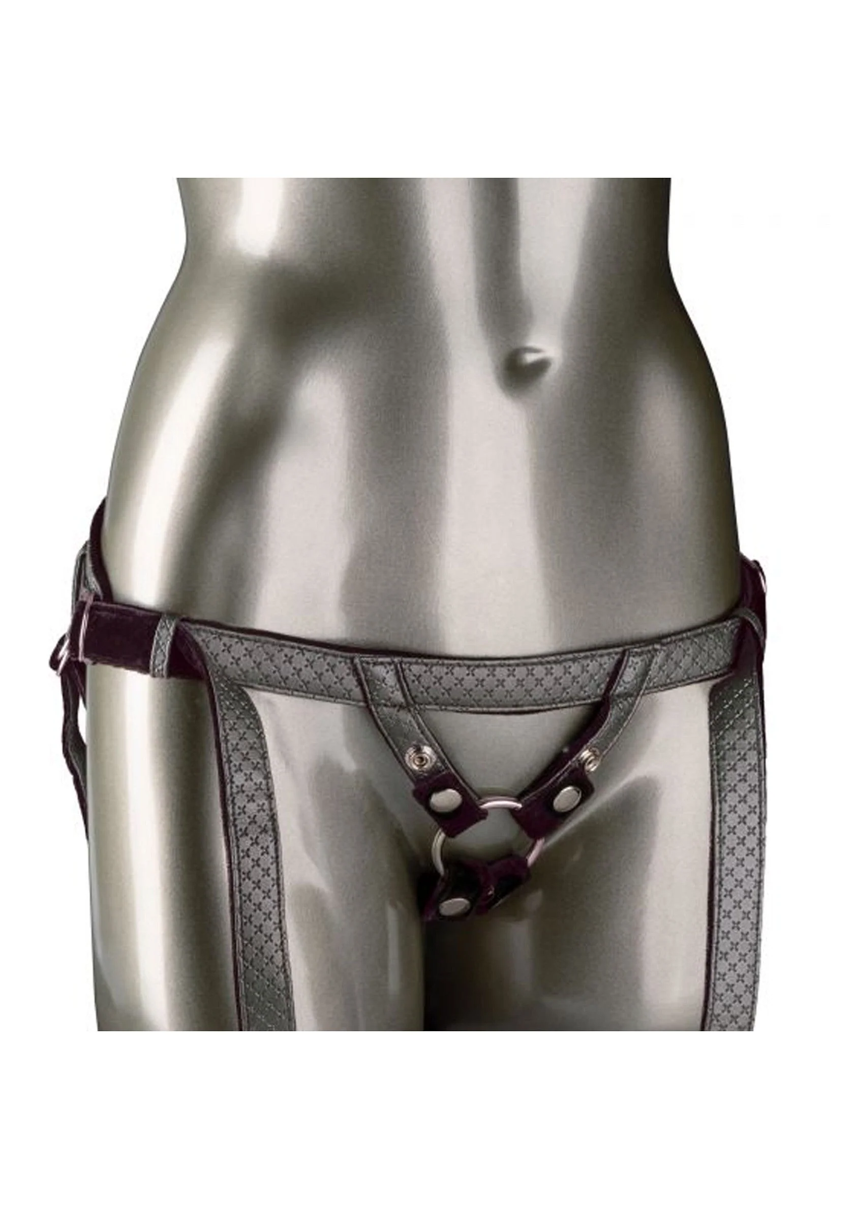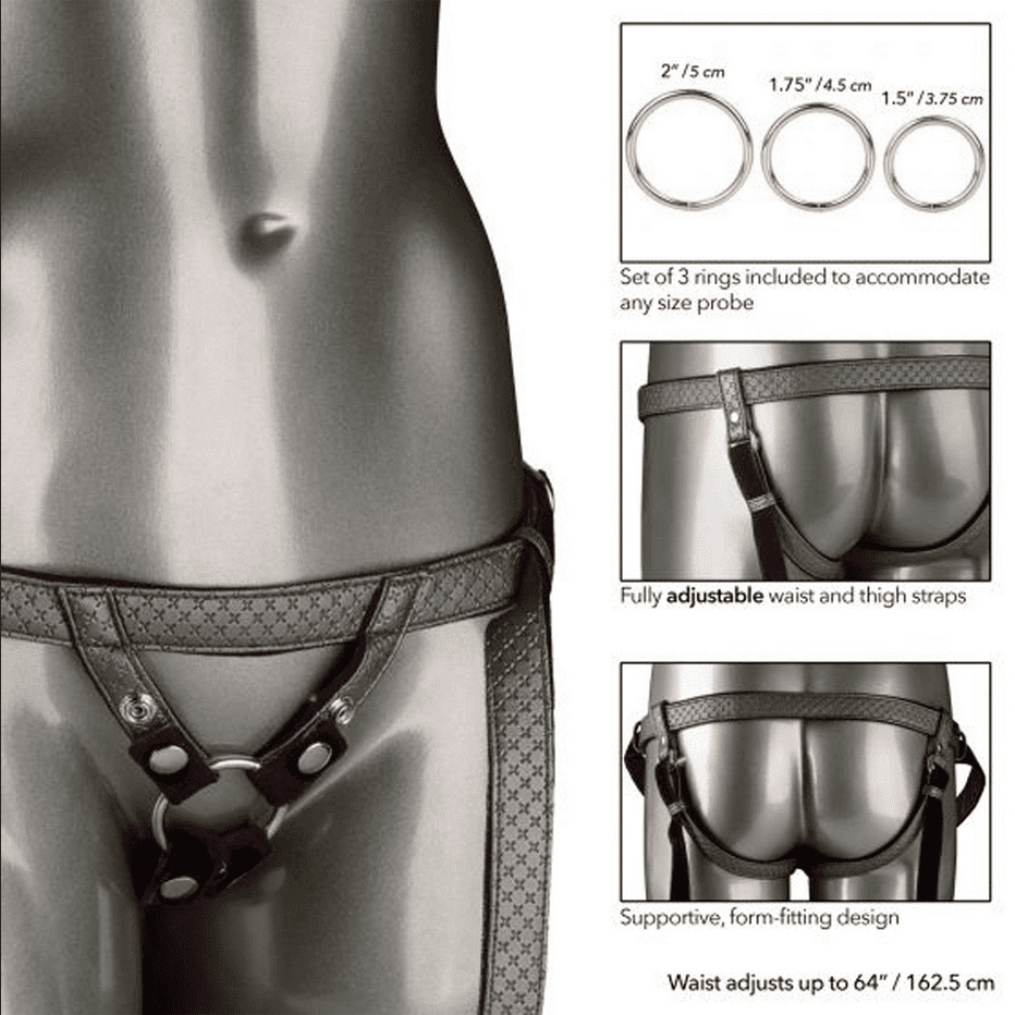 Der The Regal Duchess Harness von der Her Royal Harness Linie von Calexotics ist ein günstiger, grössenverstellbarer Harness im silbernen Metallic-Look. Er ist aus veganem Leder gefertigt und innen mit Samt ausgekleidet, das sich auf der Haut angenehm anfühlt und nicht scheuert. Die Bänder sind mit Schnallen grössenverstellbar. Somit eignet sich der Harness für einen Hüftumfang von bis zu 162.5 cm. Er ist am Schritt offen und bereitet auch der tragenden Person Klitoris und Vulvastimualtion. Drei metallene Druckknöpfe sichern den O-Ring aus Metall und halten alles an Ort und Stelle, auch bei intensiven Bewegungen. Mit den drei mitgelieferten O-Ringen können Dildos verschiedener Grössen getragen werden.