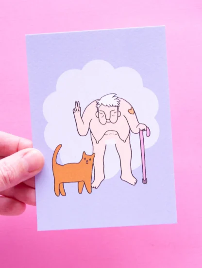 Gezeichnete Postkarte mit blauem Hintergrund. Eine ältere nackte gebückte Person mit Gehstock die ein Peace Zeichen macht. Vor ihr steht eine braune Katze.